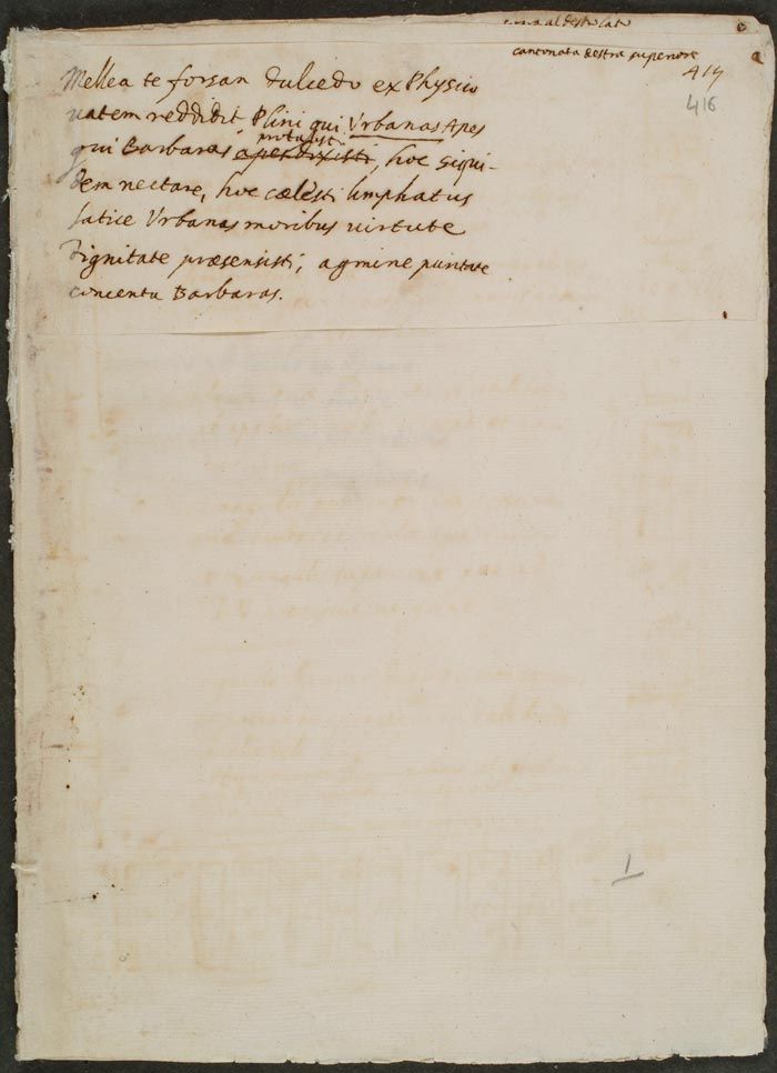 Forse, Plinio, la dolcezza del miele fece di te, filosofo naturale, un vate, tu che rivelasti le api urbane e le barbare. Certo inebriato da questo nettare, da questo lattice celeste, presentisti le urbane dai costumi, dalla virtù e dalla dignità , le barbare dalla schiera, dalla purezza, dall'armonia.