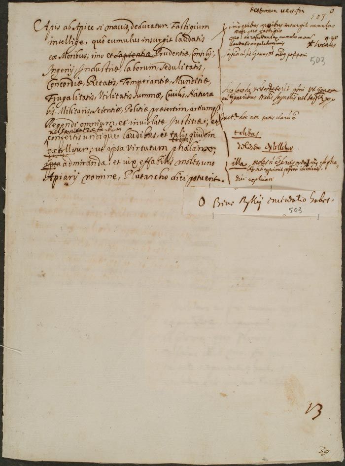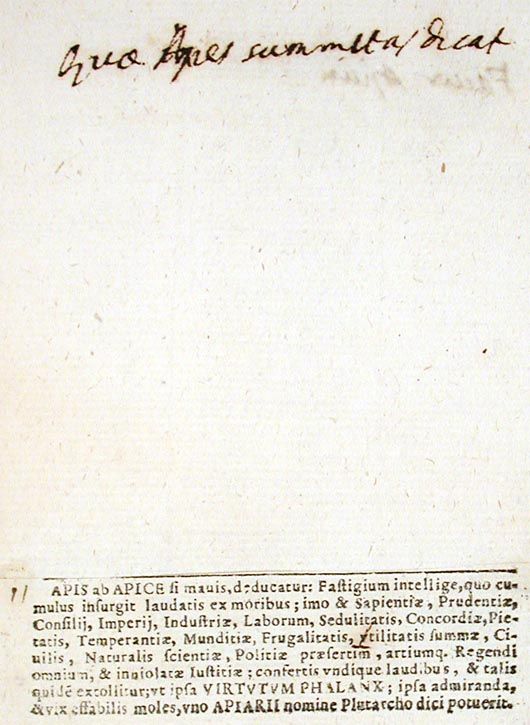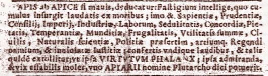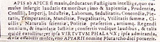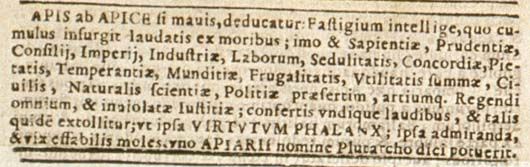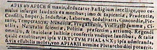 eApis ab apice si mavis, deducatur:19 Fastigium intellige, quo cumulus insurgit laudatis ex moribus; imo et Sapientiae, Prudentiae, Consilii, Imperii, Industriae, Laborum, Sedulitatis, Concordiae, Pietatis, Temperantiae, Munditiae, Frugalitatis, Utilitatis summae, Civilis, Naturalis scientiae, Politiae praesertim, artiumque. Regendi omnium, et inviolatae iustitiae; confertis undique laudibus, et talis quidem extollitur; ut ipsa virtutum phalanx; ipsa admiranda, et vix effabilis moles, uno apiarii nomine Plutarcho dici potuerit20.