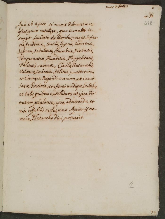 Se preferisci, il nome di ape si faccia discendere da apex, e con quel termine intendi il fastigio cui giunge il cumulo originato dalla lode dei costumi, anzi della sapienza, della prudenza, del consiglio, del comando, dell'operosità, della concordia, della pietà, della temperanza, della purezza, della frugalità, della somma utilità, della scienza civile e naturale, particolarmente della costituzione dello stato, delle arti. Da ogni parte lodata, si celebra così che tale falange di virtù e la dimensione stessa, degna di stupore e a malapena descrivibile, Plutarco poté definire con il solo nome di «apiarium».
