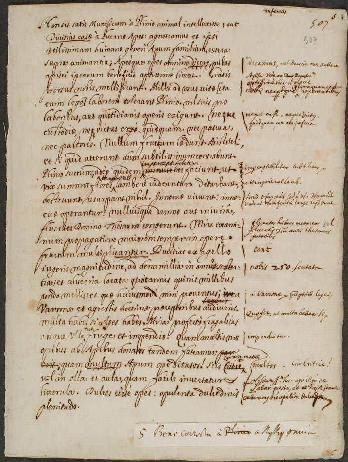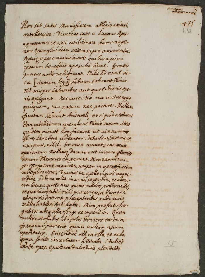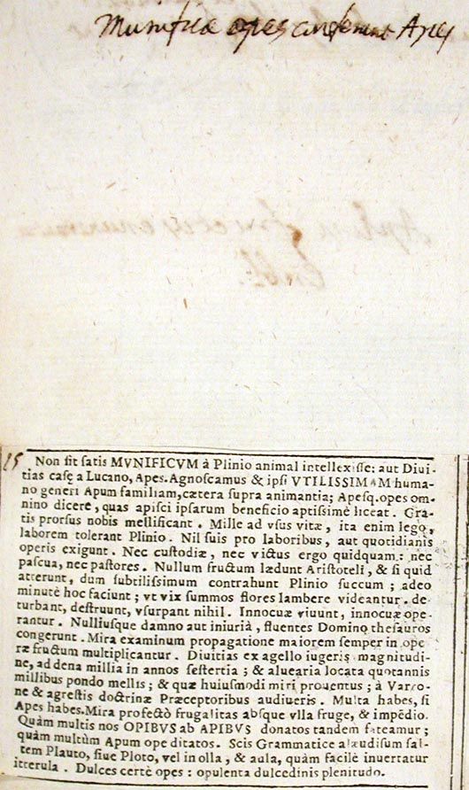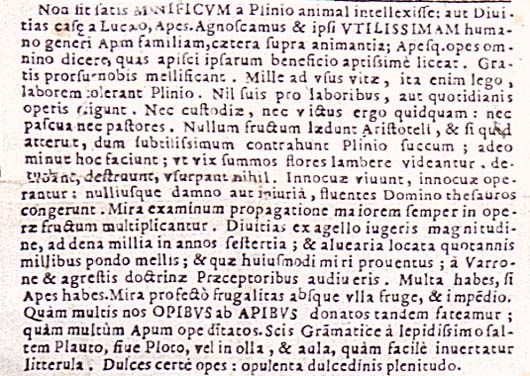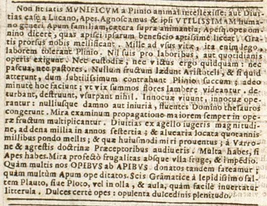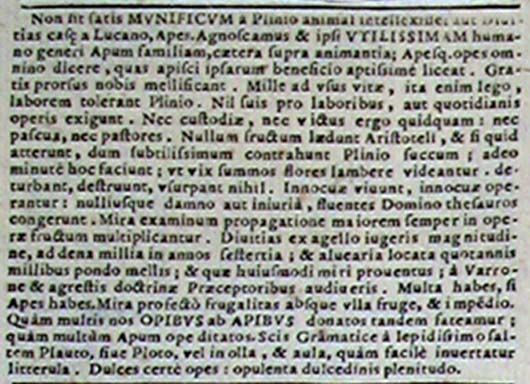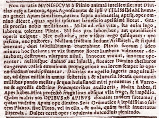 Non basti che Plinio abbia ritenuto l'ape un animale generoso o che Lucano l'abbia creduta ricchezza della casa. Riconosciamo noi stessi che la famiglia delle api è la più utile per il genere umano e che le api si possono definire a buon diritto una grande ricchezza che è possibile acquisire nei modi più adatti grazie al loro beneficio. Esse invero producono per noi il miele senza ricevere alcun compenso. Per Plinio, così infatti leggiamo, sopportano mille fatiche legate alle necessità della vita, e nulla chiedono in cambio dei loro sforzi o dei lavori che quotidianamente svolgono. Non hanno in alcun modo bisogno di custodia o di nutrimento, non richiedono pascoli né pastori. Per Aristotele non nuocciono ad alcun frutto, e per Plinio sfregano un fiore finché non estraggono un succo lievissimo, e ciò avviene così minutamente che a malapena sembrano sfiorare la parte alta dei fiori: nulla deturpano, nulla distruggono, nulla usurpano. Vivono e operano innocue e accumulano per il loro padrone fluidi tesori senza che alcuno abbia a ricevere danno o ingiuria. Propagandosi le loro schiere mirabilmente, si moltiplicano le loro opere con utilità crescente. Dalla lettura di Varrone e dai maestri della dottrina agreste apprenderai che da un campo di un iugero si potranno ricavare ricchezze pari a circa diecimila sesterzi, e che dall'aver impiantato favi si potranno guadagnare ogni anno mille libbre di miele, e i proventi saranno tutti di questo straordinario genere. Possiedi molto, se possiedi le api, e certo è ammirevole la loro parsimonia, aliena da ogni frutto e da ogni spesa. E dunque, infine, riconosciamo quanto numerosi sono i doni che riceviamo dalle api e con quale abbondanza ci arricchisce l'opera loro. Sai dal punto di vista grammaticale quanto sia facile invertire una piccola lettera: alludo ai versi sapidi di Plautus-Plotus e al gioco di parole Aula-Olla. Certo dolci le opere delle api, pienezza dolcissima.