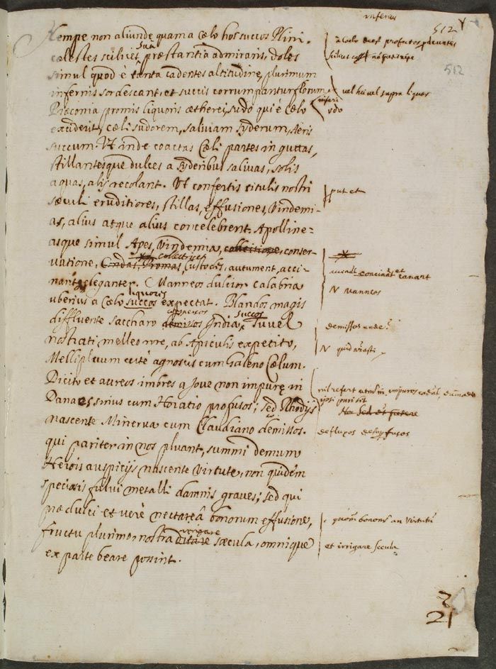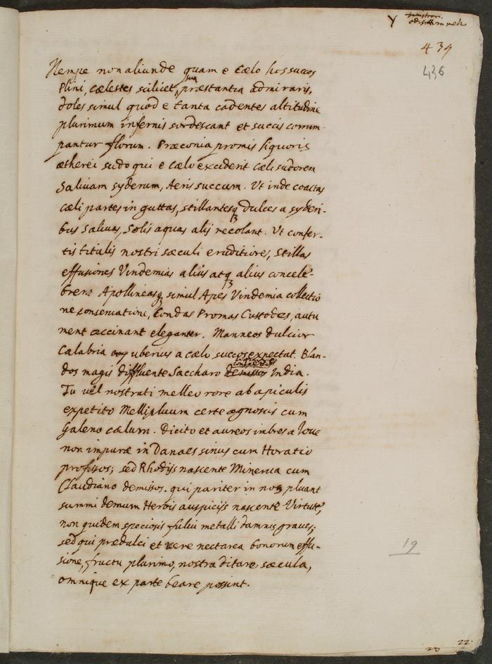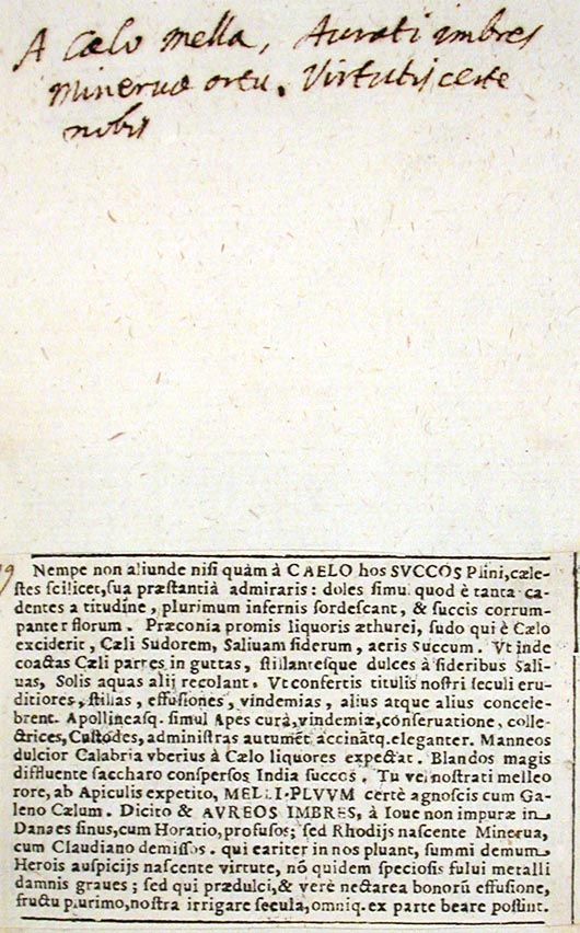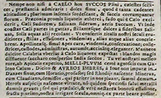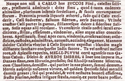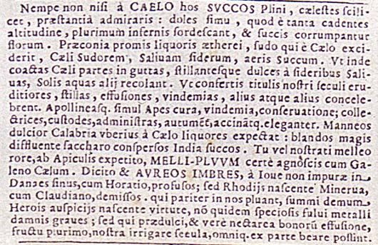 Tu, Plinio, ammiri questi succhi dal cielo, cioè celesti, per la loro importanza, ma nel contempo ti duoli del fatto che, cadendo da un'altezza tanto elevata sin nelle profondità della terra, smarriscono gran parte della loro purezza e si corrompono negli umori dei fiori. Fai l'elogio del liquore etereo che discende dal cielo sereno, sudore del cielo, saliva delle stelle, succo dell'aria, cosicché poi altri raccolgono le parti del cielo ridotte in gocce, le dolci salive distillate dal cielo e le acque del sole e gli uomini più eruditi del nostro tempo celebrano, gli uni e gli altri, l'effondersi delle stille e i raccolti. Nel contempo stimino le api apollinee per la cura, il raccolto e la conservazione quali raccoglitrici, custodi, ministre e le cantino elegantemente. La Calabria più dolce aspetta più abbondanti i liquori della manna dal cielo, l'India i succhi aspersi, più dolci dello zucchero. Tu certo riconosci, con Galeno, quel cielo mellipluo grazie alla nostra rugiada di miele ricercata dalle api. Dì, con Orazio, anche le auree piogge profuse da Giove sul seno di Danae, ma, con Claudiano, cadute sui Rodii alla nascita di Minerva; e quelle piogge ugualmente ci aspergono quali auspici nell'ora in cui sorge la virtù di un sommo eroe, non pesanti per i mali evidenti del fulvo metallo, ma dolcissime, atte ad irrigare i nostri secoli e a renderli ovunque felici grazie al nettare che effonde ricchezze e a moltissimi frutti.