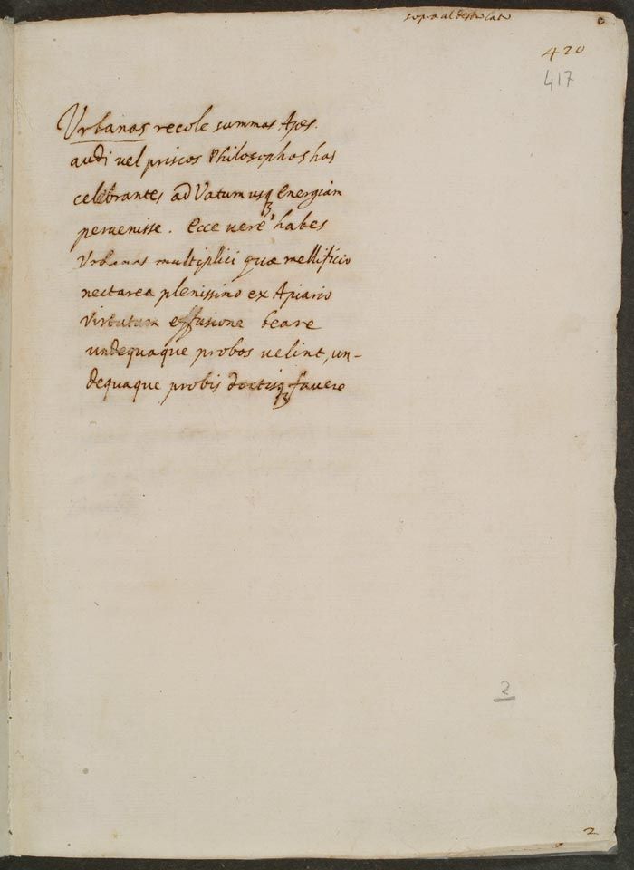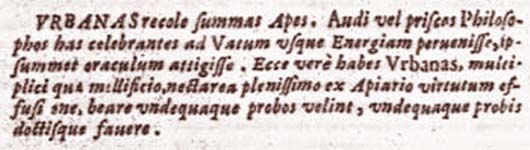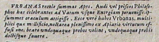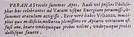 Urbanas recole summas Apes. Audi vel priscos Philosophos has celebrantes ad vatum usque Energiam pervenisse, ipsummet oraculum attigisse. Ecce vere habes urbanas, multiplici quae mellificio, nectarea plenissimo ex Apiario virtutum effusione, beare undequaque probos velint, undequaque probis doctisque favere.3