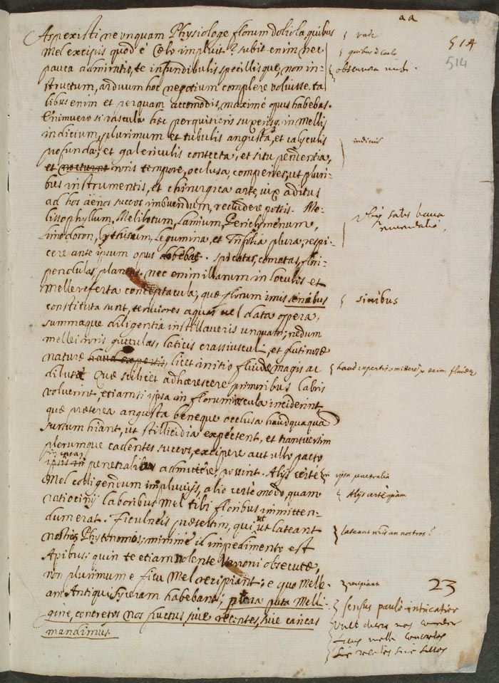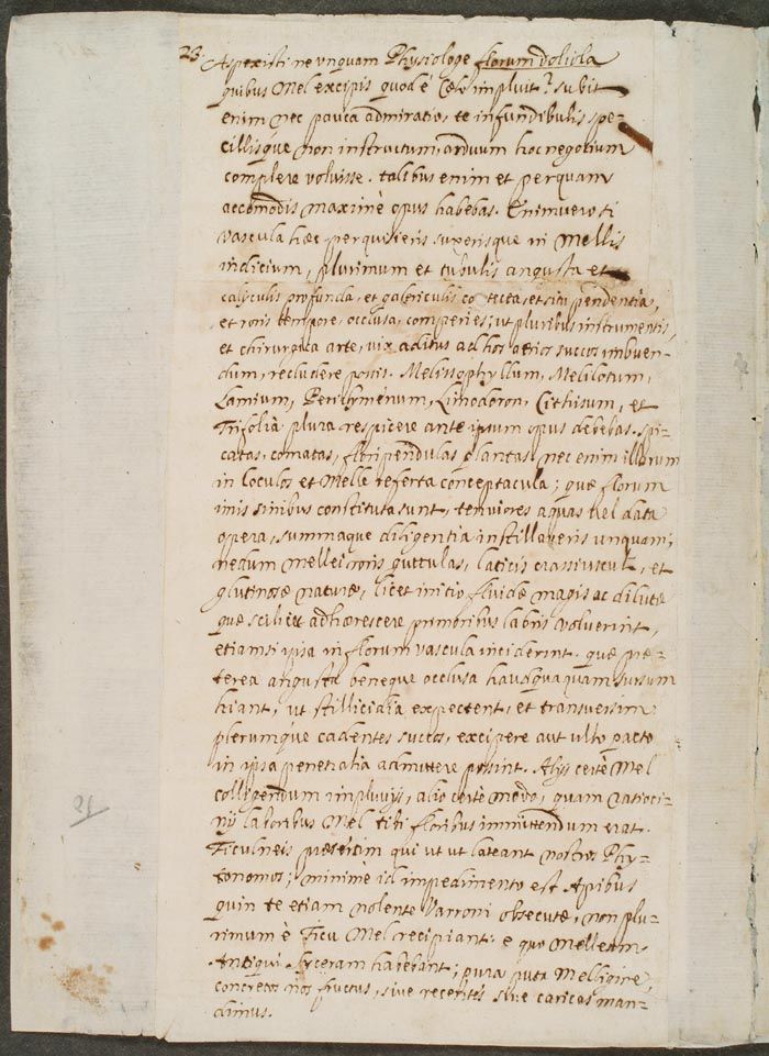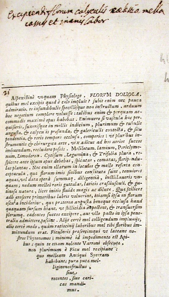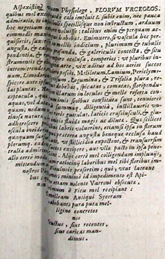 Hai mai osservato con occhi di naturalista gli orciuoli dei fiori dai quali raccogli il miele piovuto dal cielo? Succede che, e non è poca l'ammirazione, senza disporre di imbuti e di sonde, sarebbe arduo voler portare a termine questa operazione: avresti avuto bisogno di tali strumenti sì convenienti. In verità, se avrai scrutato questi piccoli vasi e avrai succhiato alla ricerca di un indizio del miele, li scoprirai tanto angusti per le piccole tube, profondi per i piccoli calici, coperti di piccoli berretti di pelo, pendenti nella loro disposizione, occlusi nel tempo della rugiada: così che con moltissimi strumenti e con arte chirurgica potresti a malapena aprire passaggi per introdurre questi aerei succhi. Prima di questa stessa opera avresti dovuto studiare il melitoto, il lamio, il periclimeno, il limodoro, il citiso, i legumi e i moltissimi tipi di trifoglio, le piante spigate, chiomate, floripendule. E mai verserai nei loculi di quelle piante e nei ricettacoli ricolmi di miele, che si costituiscono nelle parti più interne dei fiori, le più tenui sostanze acquose, anche ponendovi mano con la massima attenzione; né tantomeno le piccole gocce di miele rugiadoso, di lattice un poco grasso e di natura glutinosa, sebbene all'inizio più fluide e diluite. Esse vorranno naturalmente aderire alle prime labbra dei fiori, anche se cadranno all'interno delle loro bocche che, strette e occluse, restano aperte, sebbene non verso l'alto, per attendere la caduta delle gocce e poter accogliere i succhi che discendono perlopiù trasversalmente, o in nessun altro modo introdurle negli stessi penetrali. Certo il miele avrebbe dovuto essere raccolto con altre piogge o certo in altra maniera piuttosto che essere da te introdotto nei fiori con l'ausilio della ragione umana. Specialmente nei fichi, nascosti ai nostri botanici, senza che ciò sia di minimo impedimento alle api; che anzi, per quanto tu non voglia, seguendo Varrone, esse non raccolgono moltissimo miele dal fico, dal quale gli antichi traevano il miele di Sicara, frutti composti di pura e schietta propoli che noi mangiamo sia freschi sia maturi.