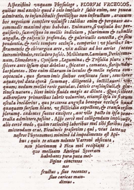 oAspexistine unquam physiologe, florum urceolosII, quibus mel excipis quod e caelo impluit ?65 Subit enim, nec pauca admiratio, te infundibulis specillisque non instructum, arduum hoc negotium complere voluisse: talibus enim et perquam accommodis maxime opus habebas.66 Enimvero, si vascula haec perquisieris, suxerisque in mellis indicium, plurimum et tubulis angusta, et calyculis profunda, et galericulis contecta, et situ pendentia, et roris tempore occlusa, comperies: ut pluribus instrumentis et chirurgica arte, vix aditus ad hos aerios succos intromittendosIII, recludere possis. Melilotum, Lamium, Periclymenum, Limodorun, Cytisum, Legumina, et Trifolia plura, respicere ante ipsum opus debebas, spicatas, comatas, floripendulas plantas. Nec enim illarum in loculos et melle referta conceptacula, quae florum imis sinibus constituta sunt, tenuiores aquas, vel data opera summaque diligentia, instillaveris unquam; nedum mellei roris guttulas, laticis crassiusculi, et glutinosae naturae, licet initio fluidae magis ac dilutae.67 Quae scilicet adhaerescere primoribus labris voluerint, etiamsi ipsa in florum oscula inciderint, quae praeterea angusta beneque occlusa haud quaquam sursum hiant, ut stillicidia expectent, et transversim plerumque cadentes succos excipere, aut ullo pacto in ipsa penetralia admittere, possint. Aliis certe mel colligendum impluviis, alio certe modo, quam ratiocinii laboribus mel tibi floribus immittendum erat. Ficulneis praesertim; qui, utut lateant nostros Phytonomos; minime id impedimento est Apibus; quin te etiam nolente Varroni obsecutae, non plurimum e Ficu mel recipiant: quo melleam Antiqui Syceram habebant; pura puta melligine concretosIV nos fructus, sive recentes, sive caricas mandimus.68