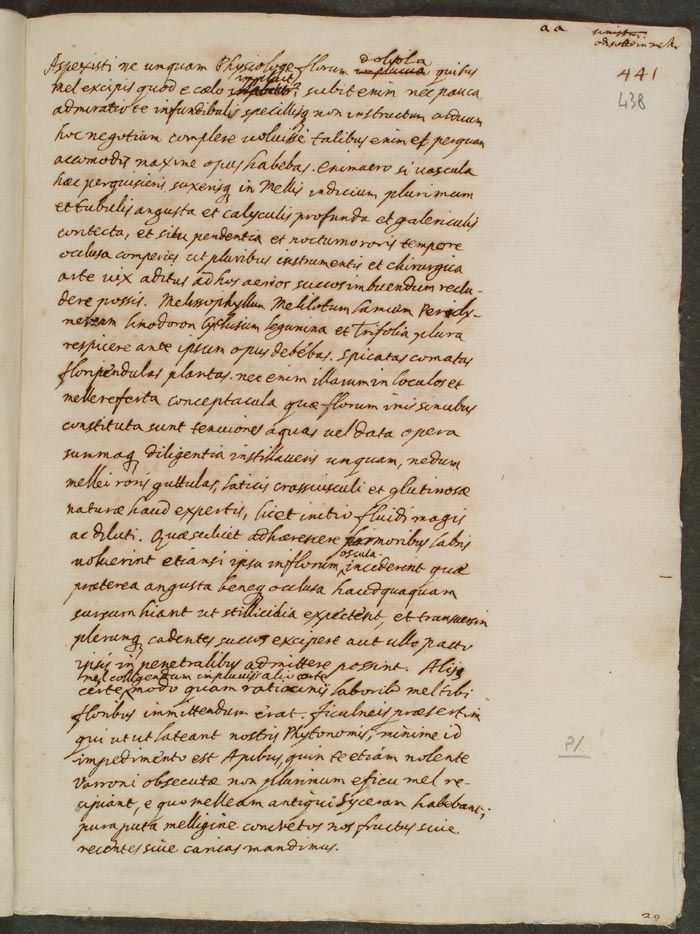 67. Sulla consistenza e la natura del miele nella fase di deposito, precedente a quella della raccolta, erano state avanzate diverse ipotesi dagli antichi naturalisti. Cesi riprende e rielabora qui quella pliniana, secondo la quale, al momento della caduta dal cielo, il miele apparirebbe «liquido come l'acqua», fermentando e purificandosi progressivamente soltanto dopo la sua deposizione, fino al punto di farsi denso e di essere ricoperto da una leggera membrana, prodotta dal processo di solidificazione della stessa fermentazione (Plinio, NH XI, 13, 32).