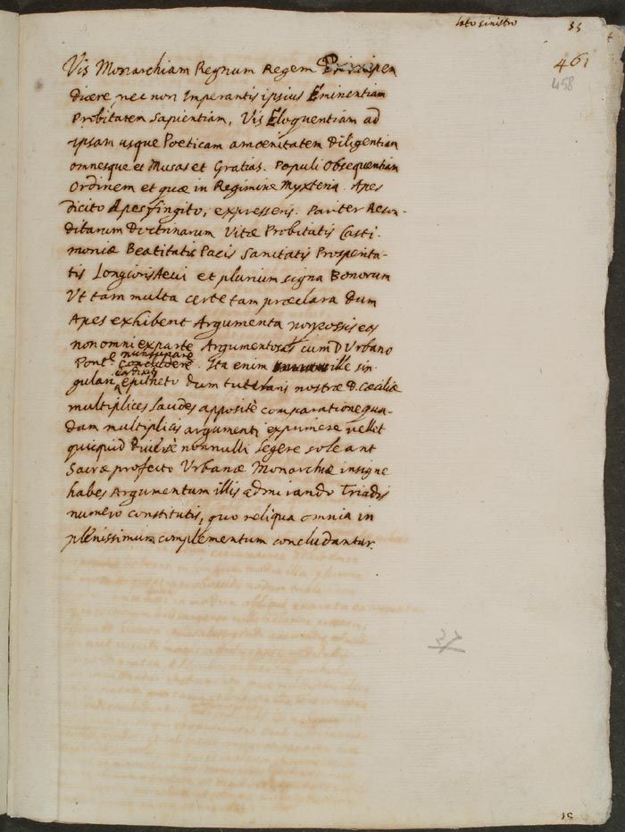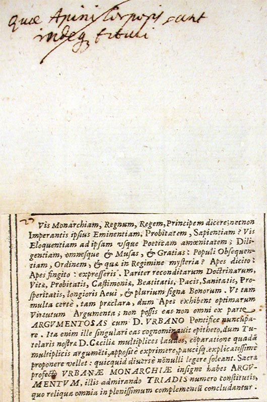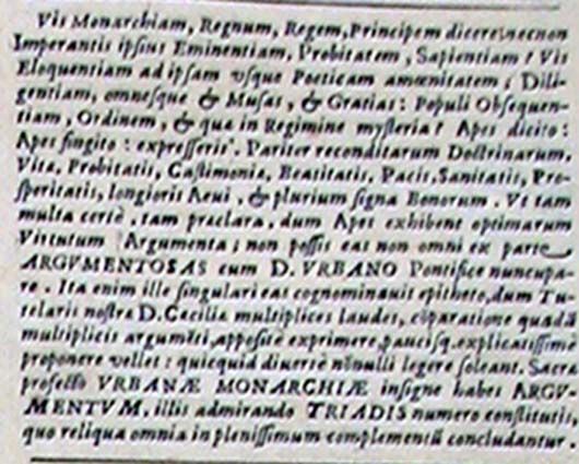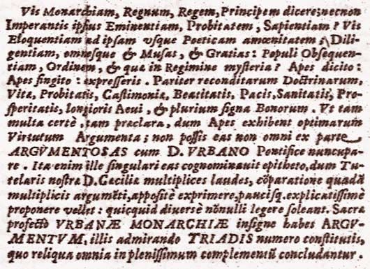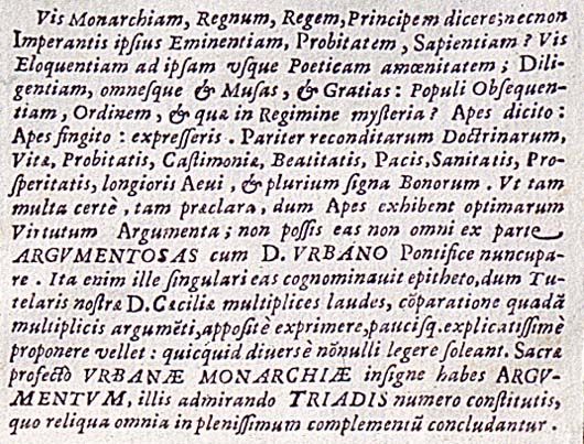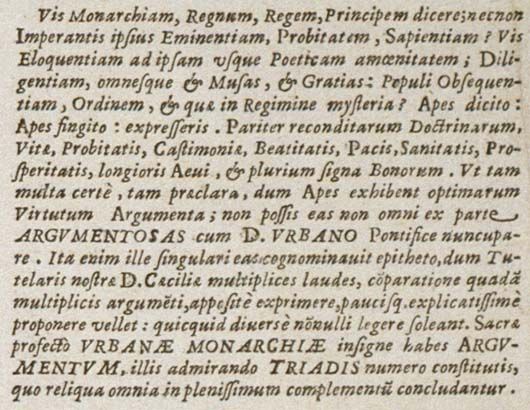 Vuoi parlare della monarchia, del regno, del re, del principe, e inoltre della grandezza, della rettitudine, della sapienza di colui che comanda? Vuoi un'eloquenza che giunga fino al godimento della poesia? Vuoi la cura e tutte le Muse e le Grazie, l'obbedienza di un popolo, l'ordine, e quelli che sono i misteri del governare? Parla delle api, raffigurati le api, e avrai espresso il concetto, e parimenti i segni delle profonde dottrine, della vita, della probità, della purezza, della beatitudine, della pace, della salute, della prosperità, della longevità, delle molteplici ricchezze. Così che non potresti non chiamarle, con il pontefice Urbano, da ogni parte «ricche di segni», dal momento che le api mostrano così tanti e chiari segni di ottime virtù. Infatti egli le denominò con questo singolare epiteto mentre voleva esprimere acconciamente le molteplici lodi della nostra protettrice Cecilia con un paragone variamente argomentato; altri invece sogliono leggere tutto questo in altro modo. E tu certo hai una prova insigne della monarchia urbaniana nella meravigliosa cifra di quella ordinata triade dove tutte le cose si conchiudono compiutamente compendiate.