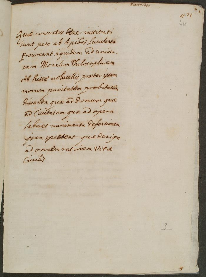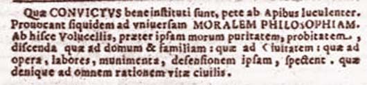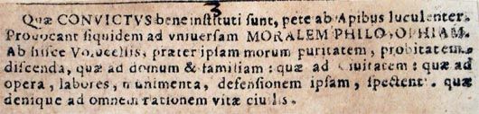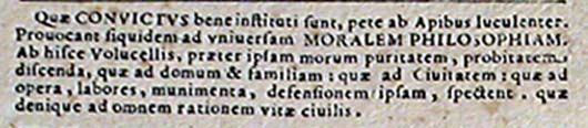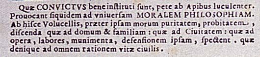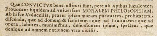 Quae convictus bene instituti sunt, pete ab Apibus luculenter. Provocant siquidem ad universam moralem philosophiam. Ab hisce Volucellis, praeter ipsam morum puritatem, probitatem, discenda, quae ad domum et familiam: quae ad Civitatem: quae ad opera, labores, munimenta, defensionem ipsam, spectent, quae denique ad omnem rationem vitae civilis.4