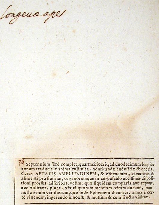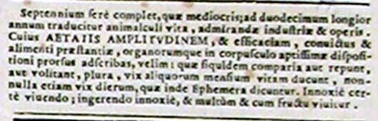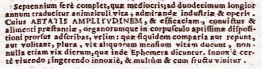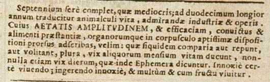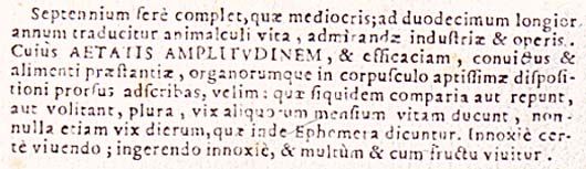vSeptennium fere complet, quae mediocris; ad duodecimum longior annum traducitur animalculi vita, admirandae industriae et operis. Cuius aetatis amplitudinem, et efficaciam, convictus et alimenti praestantiae, organorumque in corpuscolo aptissimae dispositioni prorsus adscribas, velim: quae siquidem comparia aut repunt, aut volitant, plura, vix aliquorum mensium vitam ducunt, nonnulla etiam vix dierum, quae inde ephemera dicuntur. Innoxie certe vivendo; ingerendo innoxie, et multum et cum fructu vivitur.117