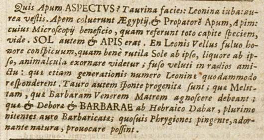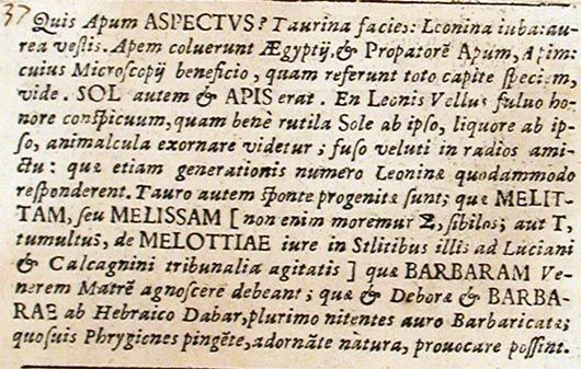 Quis apum aspectus? Taurina facies: Leonina iuba: aurea vestis. Apem coluerunt Aegyptii et Propatorem Apum, Apim: cuius Microscopii beneficio, quam referunt toto capite speciem, vide. Sol autem et apis erat. En Leonis Vellus fulvo honore conspicuum, quam bene rutila Sole ab ipso, liquore ab ipso, animalcula exornare videtur; fuso veluti in radios amictu: quae etiam generationis numero Leoninae quodammodo responderent. Tauro autem sponte progenitae sunt; quae melittam, seu melissam [non enim moremur Σ, sibilos; aut Τ, tumulus, de mellottiae iure in Stlitibus illis ad Luciani et Calcagnini tribunalia agitatis]VIII quae barbaram Venerem Matrem agnoscere debeant; quae et Deborae et Barbarae ab Hebraico Dabar, plurimo nitentes auro Barbaricatae; quosvis Phrygiones pingente, adornante natura, provocare possint.118