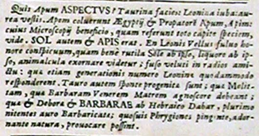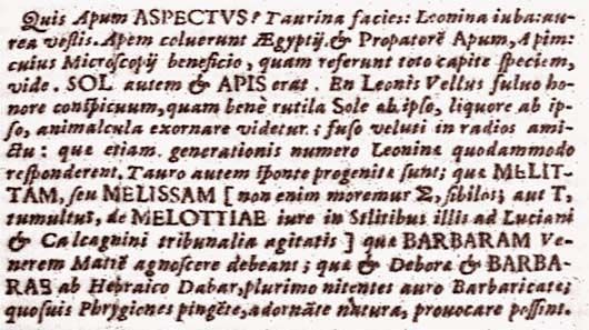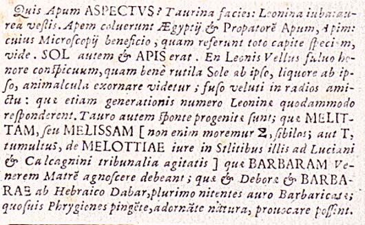 Qual è l'aspetto delle api? Figura taurina, criniera leonina, veste dorata. Gli Egizi onorarono l'ape e Api, il loro progenitore: osserva, avvalendoti del microscopio, come ne riproducono l'aspetto in tutta la testa. Del resto il sole era Api. Certo il pelo del leone, ragguardevole per la nobiltà del colore fulvo, come bene sembra adornare i piccoli animali rosseggianti grazie al sole stesso e alla stessa fluidità, come una veste cosparsa di raggi; questi piccoli animali in un certo modo corrisponderebbero alla cifra della generazione leonina. D'altra parte le api sono spontaneamente generate dal toro ed esse devono riconoscere Melitta o Melissa (non intratteniamoci, infatti, sulla ''S'' di ''sibilo'' e sulla ''T'' di ''tumulo'' e sul giusto termine di ''Melottia'' come in quelle liti che si agitano presso i tribunali di Luciano e Calcagnini) e la barbara madre Venere; esse, deborae e barbarae dall'ebraico dabar, ricamatrici splendenti in virtù dell'oro abbondante, sono in grado di sfidare tutti i frigi, auspice la natura che le dipinge e adorna.