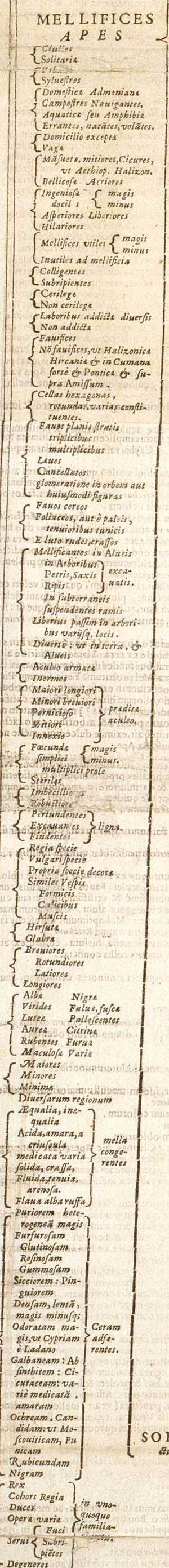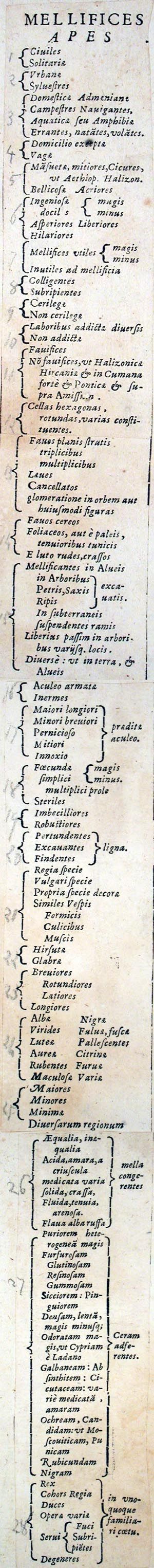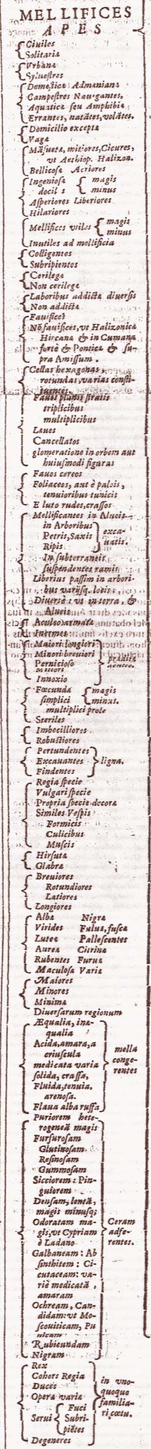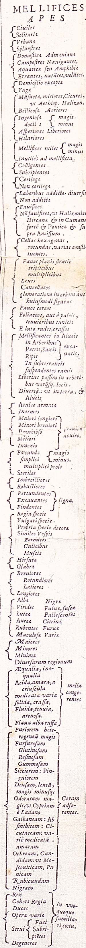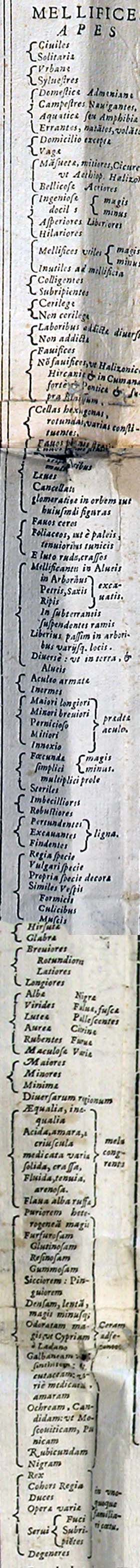 130. L'intero schema che segue 'fotografa' l'articolata situazione descrittiva contenuta in tutto il corpo centrale dell'opera, quello al quale propriamente Cesi si riferisce all'interno delle sue carte preparatorie con il termine Apiarium. Questo stesso schema viene offerto dal Princeps ai suoi lettori per fornire un pronto strumento di visualizzazione della lunga catena di generi e di specie nella quale si trova disposta la grande famiglia degli insetti produttori di miele. In esso si fa ricorso all'uso ripetuto delle parentesi graffe, grazie al quale diviene possibile la resa, all'interno di un unico insieme visivo, della ramificata classificazione distesamente riportata nell'Apiarium. Esso, altresì, appare in questo modo più facilmente memorizzabile, oltre che agilmente riproducubile.