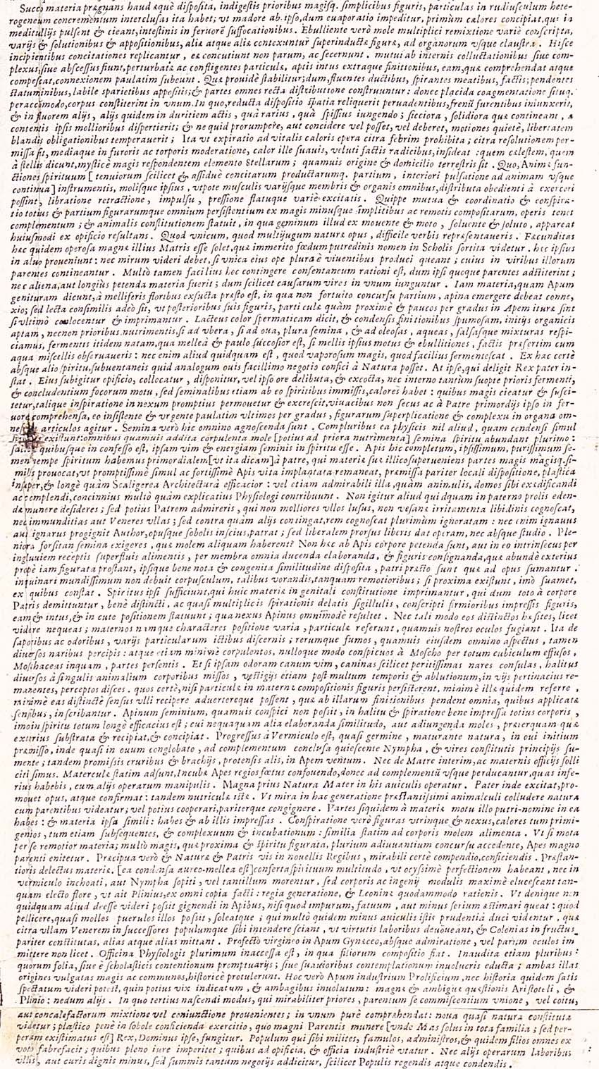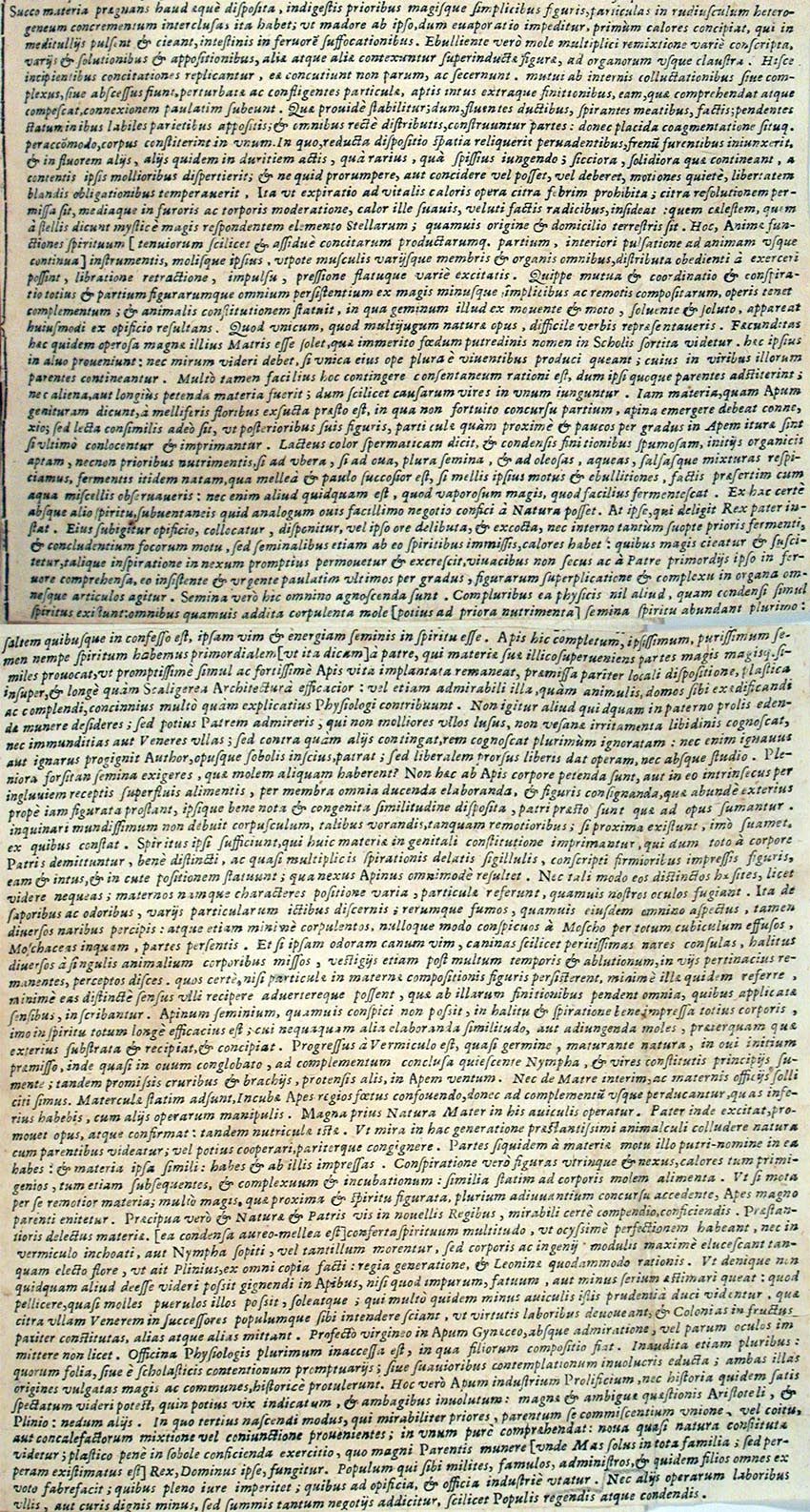 Succo materia praegnans haud aeque disposita, indigestis prioribus magisque simplicibus figuris, particulas in rudiusculum heterogeneum concrementum interclusas ita habet; ut madore ab ipso, dum evaporatio impeditur, primum calores concipiat, qui in meditulliis pulsent et cieant, intestinis in fervorem suffocationibus. Ebulliente vero mole multiplici remixtione varie conscripta,137variis et solutionibus et appositionibus, aliae atque aliae contexuntur superinductae figurae, ad organorum usque claustra. Hisce incipientibus concitationes replicantur, eae concutiunt non parum, ac secernunt, mutui ab internis colluctationibus sive complexus, sive abscessus fiunt, perturbatae ac confligentes particulae, aptis intus extraque finitionibus, eam, quae comprehendat atque compescat, connexionem paulatim subeunt. Quae provide stabilitur; dum, fluentes ductibus, spirantes meatibus, factis; pendentes statuminibus labiles parietibus appositis; et partes omnes recta distributione construuntXI: donec placida coagmentatione situque peraccommodo, corpus constiterint in unum. In quo, reducta dispositio spatia reliquerit pervadentibus, frenum furentibus iniunxerit, et in fluorem aliis, aliis quidem in duritiem actis, qua rarius, qua spissius iungendo; sicciora, solidiora quae contineant, a contentis ipsis mollioribus dispertierit; et ne quid prorumpere, aut concidere vel posset, vel deberet, motiones quiete, libertatem blandis obligationibus temperaverit; Ita ut expiratio ad vitalis caloris opera citra febrim prohibita; citra resolutionem permissa sit, mediaque in furoris ac torporis moderatione, calor ille suavis, veluti factis radicibus, insideat: quem caelestem, quem a stellis dicunt, mystice magis respondentem elemento Stellarum; quamvis origine et domicilio terrestris sit.138QuoXII Animae functiones spirituum [tenuiorum scilicet et assidue concitarum productarumque partium, interiori pulsatione ad animam usque continua] instrumentis, molisque ipsius, utpote muscolis variisque membris et organis omnibus, distributa obedientia exerceri possint, libratione retractione, impulsu, pressione flatuque varie excitatis.139Quippe mutua et coordinatio et conspiratio totius et partium figurarumque omnium persistentium ex magis minusque implicibus ac remotis compositarum, operis tenet complementum; et animalis constitutionem statuit, in qua geminum illud ex movente et moto, solvente et soluto, appareat huiusmodi ex opificio resultans. Quod unicum, quod multiiugum naturae opus, difficile verbis repraesentaveris. Faecunditas haec quidem operosa magnae illius Matris esse solet, quae immerito foedum putredinis nomen in Scholis sortita videtur. haec ipsius in alvo proveniunt: nec mirum videri debet, si unica eius ope plura e viventibus produci queant; cuius in viribus illorum parentes contineatur.140Multo tamen facilius hoc contingere consentaneum rationi est, dum ipsi quoque parentes adstiterint; nec aliena, aut longius petenda materia fuerit; dum scilicet causarum vires in unum iunguntur. Iam materia, quam Apum genituram dicunt, a melliferis floribus exsucta praesto est, in qua non fortuito concursu partium, apina emergere debeat connexio; sed lecta consimilis adeo sit, ut posterioribus suis figuris, particulae quam proxime et paucos per gradus in Apem iturae sint si ultimo conlocentur et imprimantur. Lacteus color spermaticam dicit, et condensis finitionibus spumosam, initiis organicis aptam, necnon prioribus nutrimentis, si ad ubera, si ad ova, plura semina, et ad oleosas, aqueas, salsasque mixturas respiciamus,141fermentis itidem natam, qua mellea et paulo succosior est, si mellis ipsius motus et ebullitiones, factis praesertim cum aqua miscellis observaveris: nec enim aliud quidquam est, quod vaporosum magis, quod facilius fermentescat.142 Ex hac certe absque alio spiritu, subventaneis quid analogum ovis facillimo negotio confici a Natura posset.143At ipse, qui deligit Rex pater instat. Eius subigitur opificio, collocatur, disponitur, vel ipso ore delibuta, et excocta, nec interno tantum suopte prioris fermenti, et concludentium focorum motu, sed seminalibus etiam ab eo spiritibus immissis, calores habet: quibus magis cieatur et suscitetur, talique inspiratione in nexum promptius permovetur et excrescit, vivacibus non secus ac a Patre primordiis ipso in fervore comprehensa, eo insistente et urgente paulatim ultimos per gradus, figurarum superplicatione et complexu in organa omnesque articulos agitur. Semina vero hic omnino agnoscenda sunt. Compluribus ea physicis nil aliud, quam condensi simul spiritus existunt: omnibus quamvis addita corpulenta mole [potius ad priora nutrimenta] semina spiritu abundant plurimo: saltem quibusque in confesso est, ipsam vim et energiam seminis in spiritu esse. Apis hic completum, ipsissimum, purissimum semen nempe spiritum habemus primordialem [ut ita dicam] a patre, qui materiae suae illico superveniens partes magis magisque similes provocat, ut promptissime simul ac fortissime Apis vita implantata remaneat, praemissa pariter locali dispositione, plastica insuper, et longe quam Scaligerea Architectura efficacior:144vel etiam admirabili illa, quam animulis, domos sibi exaedificandi ac complendi, concinnius multo quam explicatius Physiologi contribuunt. Non igitur aliud quidquam in paterno prolis edendae munere desideres; sed potius Patrem admireris, qui non molliores ullos lusus, non vesanae irritamenta libidinis cognoscat, nec immunditias aut Veneres ullas; sed contra quam aliis contingat, rem cognoscat plurimum ignoratam: nec enim ignavus aut ignarus progignit Author, opusque sobolis inscius, patrat; sed liberalem prorsus liberis dat operam, nec absque studio. Pleniora forsitan semina exigeres, quae molem aliquam haberent? Non haec ab Apis corpore petenda sunt, aut in eo intrinsecus per ingluviem receptis superfluis alimentis, per membra omnia ducenda elaboranda, et figuris consignanda, quae abunde exterius prope iam figurata prostant, ipsique bene nota et congenita similitudine dis