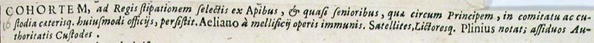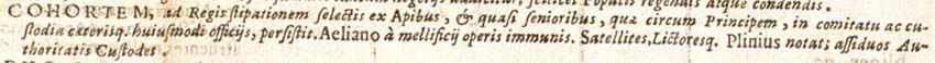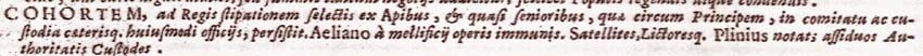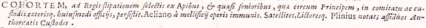 Cohortem, ad Regis stipationem selectis ex Apibus, et quasi senioribus, quae circum Principem, in comitatu ac custodia caeterisque huiusmodi officiis, persistit. Aeliano a mellificii operis immunis.151Satellites, Lictoresque Plinius notat; assiduos authoritatis custodes.152