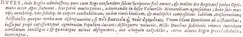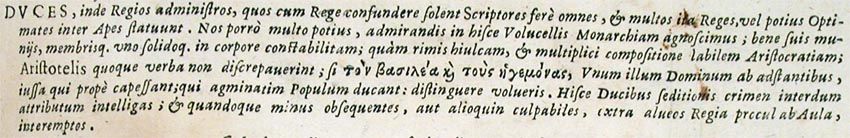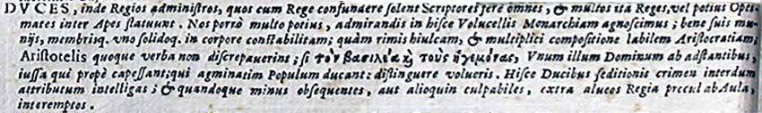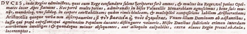 Duces, inde Regios administros, quos cum Rege confundere solent Scriptores fere omnes, et multos ita Reges, vel potius Optimates inter Apes statuunt. Nos porro multo potius, admirandis in hisce Volucellis Monarchiam agnoscimus; bene suis muniis, membrisque uno solidoque in corpore constabilitam; quam rimis hiulcam, et multiplici compositione labilem Aristocratiam; Aristotelis quoque verba non discrepaverint; si τόν βασιλέα καί τούς ηγεμόνας, Unum illum Dominum ab adstantibus, iussa qui prope capessant; qui agminatim Populum ducant: distinguere volueris. Hisce Ducibus seditionis crimen interdum attributum intelligas; et quandoque minus obsequentes, aut alioquin culpabiles, extra alveos Regia procul ab Aula, interemptos.153