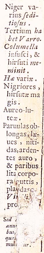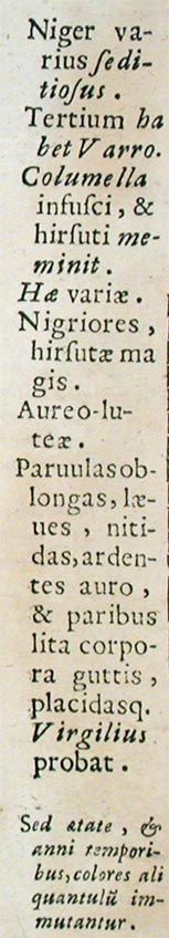 160. Questa tabella si riferisce alla sezione del testo centrale successiva a quella consacrata ai fuchi. Essa concerne il loro 'collega', 'ladro di miele', sulla cui natura diversi autori -tra i quali Cesi rammenta Varrone, Columella e Virgilio- si erano interrogati problematicamente, facendo spesso fatica a distinguerlo dai fuchi stessi.