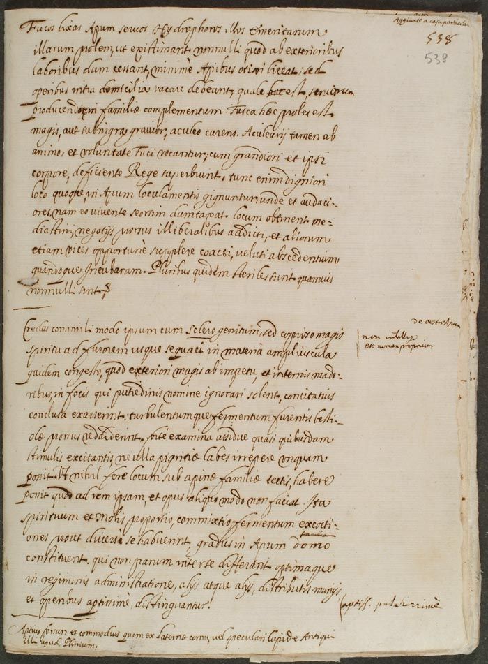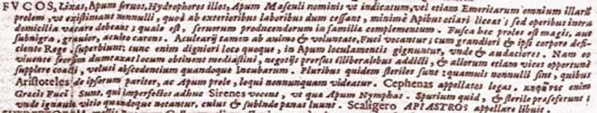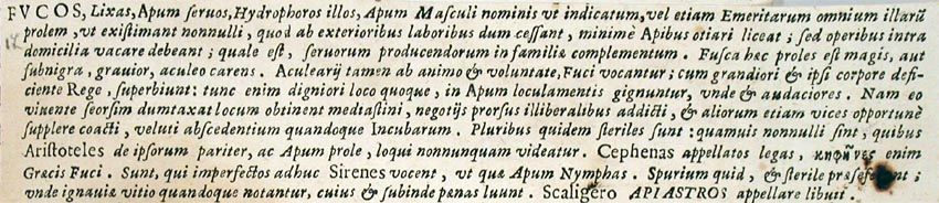 161. I passaggi relativi ai fuchi rappresentano una rielaborazione di Plinio, NH XI, 10, 28 ed Eliano, Nat. an. V, 11, da dove è propriamente tratta la notizia dell'insubordinazione dei fuchi stessi immediatamente dopo la morte del 're'. L'espressione dello Scaligero si trova nelle Adnotationes ad Aristoteles de Animalibus Historiae libri X, divulgate dal naturalista francese Philippe Jacques Maussac nel 1619. Conrad Gesner, riprendendo Eliano, aveva indicato con il nome di apiaster o apiastra gli uccelli melissofagi, detti meropi. Cfr. Conradi Gesneri Medici Tigurini [...] Historiae Animalium liber III qui est de avium natura [...], Tiguri, C. Froschouerum, 1555, p. 575. Per l'uso dell'espressione apiastros si veda anche quanto riferito in De animalibus insectis libri septem, cum singulorum iconibus ad vivum expressis. Autore Ulysse Aldrovando [...], op. cit., p. 89.