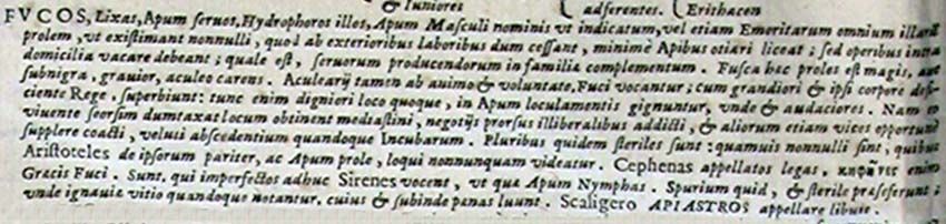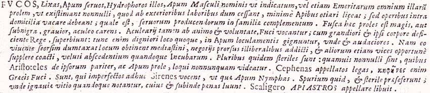 Fucos, Lixas, Apum servos, Hydrophoros illos, Apum Masculi nominis ut indicatum, vel etiam Emeritarum omnium illarum prolem, ut existimant nonnulli, quod ab exterioribus laboribus dum cessant, minime Apibus otiari liceat; sed operibus intra domicilia vacare debeant; quale est, servorum producendorum in familiae complementum. Fusca haec proles est magis, aut subnigra, gravior, aculeo carens. Aculearii tamen ab animo et voluntate, Fuci vocantur; cum grandiori et ipsi corpore deficiente Rege, superbiunt: tunc enim digniori loco quoque, in Apum loculamentis gignuntur, unde et audaciores. Nam eo vivente seorsim dumtaxat locum obtinent mediastini, negotiis prorsus illiberalibus addicti, et aliorum etiam vices opportune supplere coacti, veluti abscedentium quandoque Incubarum. Pluribus quidem steriles sunt: quamvis nonnulli sint, quibus Aristoteles de ipsorum pariter, ac Apum prole, loqui nonnunquam videatur. Cephenas appellatos legas, κηφήνες enim Graecis Fuci. Sunt, qui imperfectos adhuc Sirenes vocent, ut quae Apum Nymphas. Spurium quid, et sterile praeseferunt; unde ignaviae vitio quandoque notantur, cuius et subinde paenas luunt. Scaligero apiastros appellare libuit.161