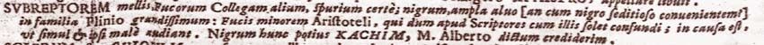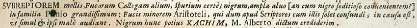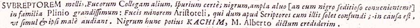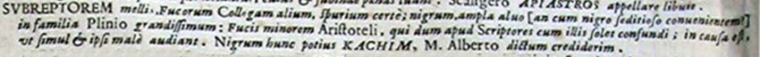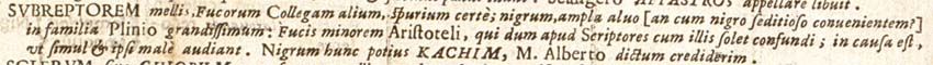 Subreptorem mellis, Fucorum Collegam alium, spurium certe; nigrum, ampla alvo [an cum nigro seditioso convenientem?] in familia Plinio grandissimum: Fucis minorem Aristoteli, qui dum apud Scriptores cum illis solet confundi; in causa est, ut simul et ipsi male audiant. Nigrum hunc potius kachim, M. Alberto dictum crediderim.162