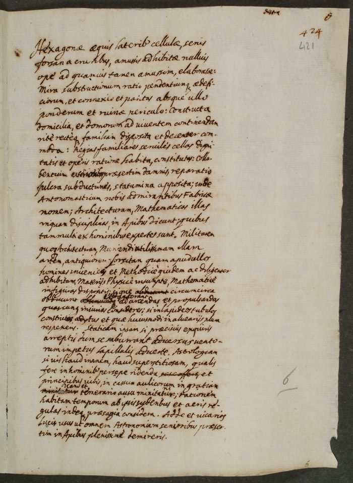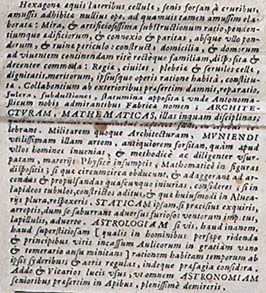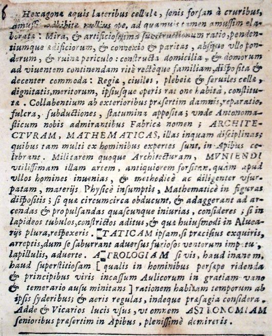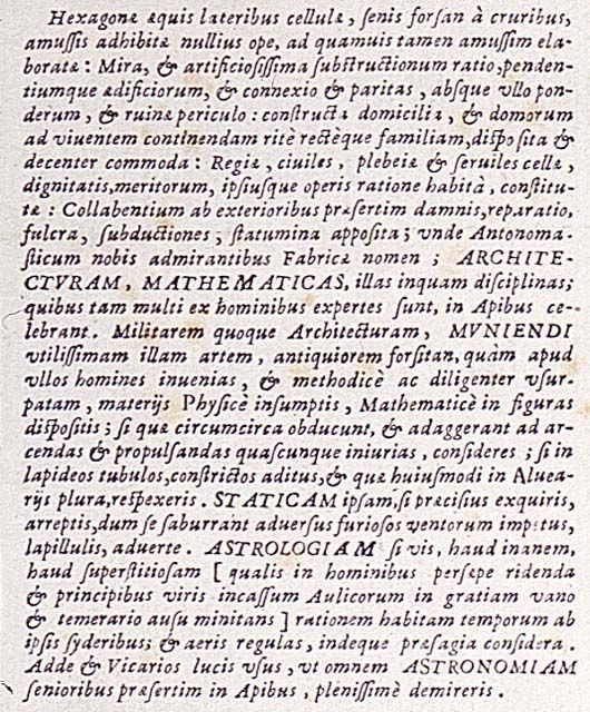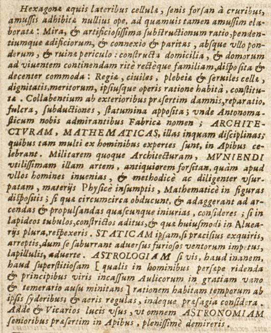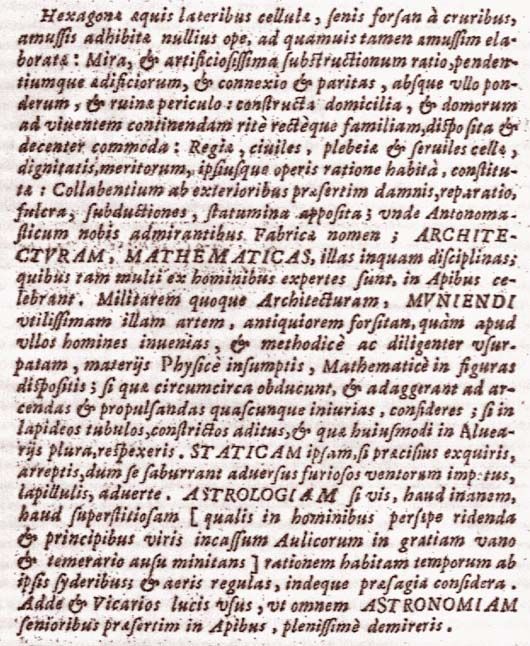 Hexagonae aequis lateribus cellulae, senis forsan a cruribus, amussis adhibitae nullius ope, ad quaemvis tamen amussim elaboratae:8 Mira, et artificiosissima substructionum ratio, pendentiumque aedificiorum, et connexio et paritas, absque ullo ponderum, et ruinae periculo: constructa domicilia, et domorum ad viventem continendam rite recteque familiam, disposita et decenter commoda: Regiae, civiles, plebeiae et serviles cellae, dignitatis, meritorum, ipsiusque operis ratione habita, constitutae. Collabentium ab exterioribus praesertim damnis, reparatio, fulcra, subductiones, statumina apposita;9 unde Antonomasticum nobis admirantibus Fabricae nomen; architecturam, mathematicas, illas inquam disciplinas; quibus tam multi ex hominibus expertes sunt, in apibus celebrant. Militarem quoque Architecturam, muniendi utilissimam illam artem, antiquiorem forsitan, quam apud ullos homines invenias, et methodice ac diligenter usurpatam, materiis Physice insumptis, Mathematice in figuras dispositis; si quae circumcirca obducunt, et adaggerant ad arcendas et propulsandas quascunque iniurias, consideres;10 si in lapideos tubulos, constrictos aditus, et quae huiusmodi in Alveariis plura, respexeris11. Staticam ipsam, si praecisius exquiris, arreptis, dum se saburrant adversus furiosos ventorum impetus, lapillulis, adverte. Astrologiam si vis, haud inanem, haud superstitiosam [qualis in hominibus persaepe ridenda et principibus viris incassum Aulicorum in gratiam vano et temerario ausu minitans] rationem habitam temporum ab ipsis syderibus; et aeris regulas, indeque praesagia considera. Adde et Vicarios lucis usus, ut omnem astronomiam senioribus praesertim in Apibus, plenissime demireris.12