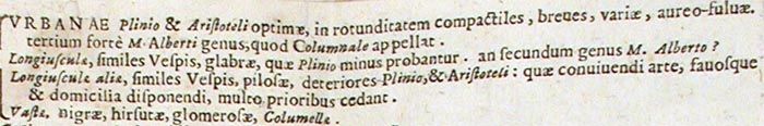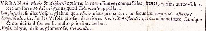 167. All'interno dei libri VIII e XXVI dell'opera De animalibus, Alberto Magno aveva distinto prima quattro, e quindi tre, generi di apes mellificantes:«Prima quidem est apis quae alveare sibi invenit in qua regem habet et favum preparat in quo mella reponit [...] Secundum autem genus est mala apis [...] Tertium autem genus quod in congregatione etiam habitat est idem quod communi nomine vespa vocant [...] Quartum autem genus est apis caeca.», «Scias autem apum mellificantium tria esse genera : quoddam enim est horridum quasi pilosum et est malum et iracundum et vocatur rusticum. Quoddam autem est subtile longum et ne illud est optimum. Sed tertium est compactum bene rotundum columnale non longum ; et illud est nobile et multum mellificativum.», entrambi i brani in Divi Alberti Magni de Animalibus libri vigintisex novissime impressi, op. cit., rispettivamente pp. 79v e 203v.