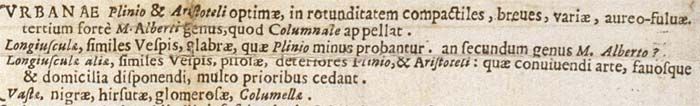 Urbanae Plinio et Aristoteli optimae, in rotunditatem compactiles, breves, variae, aureo-fulvae, tertium forte M. Alberti genus, quod Columnale appellat.