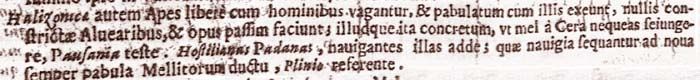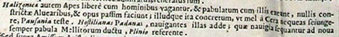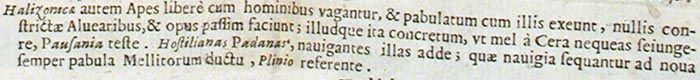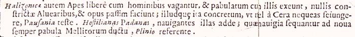 Le api halizoniche, invece, vagano liberamente con gli uomini, insieme con i quali vanno alla ricerca di cibo, null'affatto costrette negli alveari, e producono il miele qua e là; e quel miele è così denso che, secondo testimonia Pausania, non potresti mai separarlo dalla cera. Aggiungi le hostiliane padane, secondo Plinio, che navigano e, sotto la guida dei raccoglitori di miele, seguono le navi alla ricerca incessante di nuovi cibi.