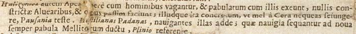 Halizonicae autem Apes libere cum hominibus vagantur, et pabulatum cum illis exeunt, nullis constrictae Alvearibus, et opus passim faciunt; illudque ita concretum, ut mel a Cera nequeas seiungere Pausania teste. Hostilianas Padanas, navigantes illas adde; quae navigia sequantur ad nova semper pabula Mellitorum ductu, Plinio referente.183