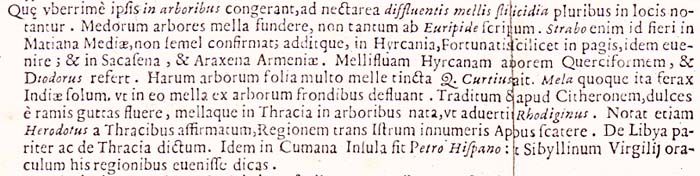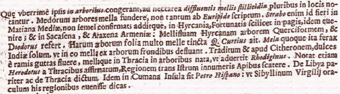 Quae uberrime ipsis in arboribus congerant, ad nectarea diffluentis mellis stillicidia pluribus in locis notantur. Medorum arbores mella fundere, non tantum ab Euripide scriptum.186Strabo enim id fieri in Matiana Mediae, non semel confirmat; additque, in Hyrcania, Fortunatis scilicet in pagis, idem evenire; et in Sacasena, et Araxena Armeniae.187Mellifluam Hyrcanam arborem Querciformem, et Diodorus refert.188Harum arborum folia multo melle tincta Q. Curtius ait.189Mela quoque ita ferax Indiae solum ut in eo mella ex arborum frondibus defluant.190Traditum et apud Citheronem, dulces e ramis guttas fluere, mellaque in Thracia in arboribus nata, ut advertit Rhodiginus.191Notat etiam Herodotus a Thracibus affirmatum, Regionem trans Istrum innumeris Apibus scatere.192De Libya pariter ac de Thracia dictum. Idem in Cumana insula fit Petro Hispano: ut Sibyllinum Virgilii oraculum his regionibus evenisse dicas.193