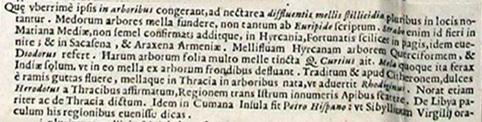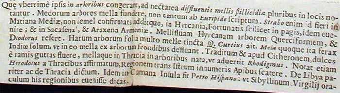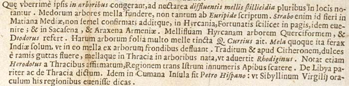 Quelle che assai copioso lo raccolgono perfino sugli alberi, presso le nettaree stille del miele fluente, si notano in più luoghi. Non solo Euripide scrisse che gli alberi dei Medi effondono miele. Infatti Strabone asserisce più volte che ciò accade a Matiana, nella Media, e aggiunge che il medesimo fenomeno si verifica in Ircania, cioè nei villaggi fortunati, a Sacasena e ad Araxena, in Media. Anche Diodoro scrive dell'albero ircano a forma di quercia che stilla miele. Quinto Curzio dice che le foglie di questi alberi sono tinte abbondantemente di miele; Mela sostiene che il suolo dell'India è così fertile che i mieli fluiscono dalle fronde degli alberi. Si tramanda che anche presso il Citerone stillano dolci gocce dai rami e che in Tracia i mieli nascono sugli alberi, come avverte Rodigino. Erodoto registra quanto affermano i Traci, che la regione transistrica è ricca di innumerevoli api. Ugualmente si dice della Libia e della Tracia, e la medesima cosa accade per Pietro Ispano nell'isola cumana, sicché potresti dire che l'oracolo sibillino di Virgilio si sia avverato in queste regioni.