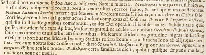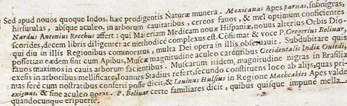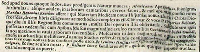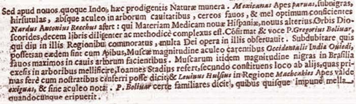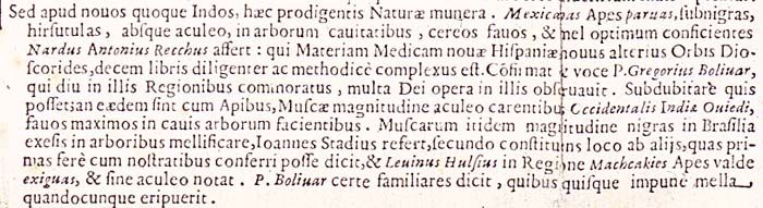 Ma anche presso i nuovi Indi esistono questi doni della natura prodiga. Nardo Antonio Recchio, il nuovo Dioscoride dell'altro emisfero, colui che con diligenza e metodo abbracciò in dieci libri la materia medica della nuova Spagna, afferma che esistono piccole api messicane quasi nereggianti, alquanto irsute, prive di pungiglione, nelle cavità degli alberi, che producono favi di cera e ottimo miele. Lo conferma a voce anche padre Gregorio Bolivar il quale, avendo soggiornato a lungo in quelle regioni, nelle api riconobbe molte opere di Dio. Chi potrebbe dubitare che siano assimilabili ad api che, a Oviedo, nell'India Occidentale, sono grandi come una mosca e prive di pungiglione, e costruiscono favi enormi nelle cavità degli alberi? Giovanni Stadio riferisce che ugualmente api nere, della grandezza di mosche, producono in Brasile miele all'interno di alberi scavati. Egli le pone al secondo posto rispetto alle altre, le prime che dice quasi paragonabili alle nostre. Anche Levino Ulsio nella regione Machakies registra api assai minuscole, prive di pungiglione; padre Bolivar le definisce domestiche, e si può sottrarre loro il miele a piacere.