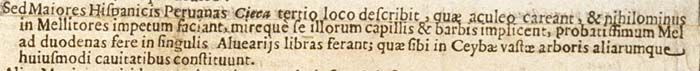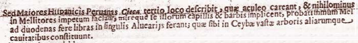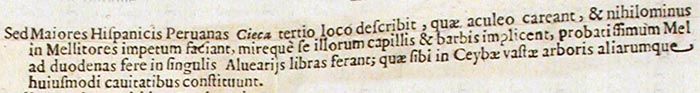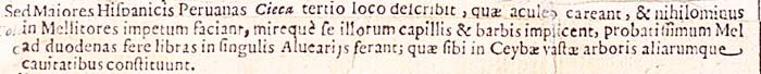 Sed Maiores Hispanicis Peruanas Cieca tertio loco describit, quae aculeo careant, et nihilominus in Mellitores impetum faciant, mireque se illorum capillis et barbis implicent, probatissimum Mel ad duodenas fere libras in singulis Alveariis ferant;IX quae sibi in Ceybae vastae arboris aliarumque huiusmodi cavitatibus constituunt.202