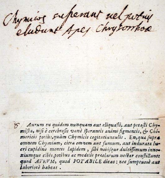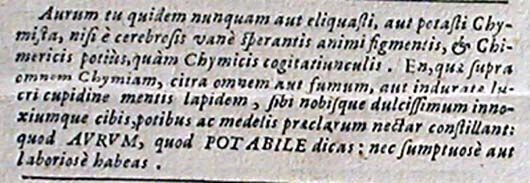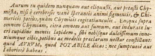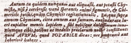 bAurum tu quidem nunquam aut eliquasti, aut potasti Chymista, nisi e cerebrosis vane sperantis animi figmentis, et Chimericis potius, quam Chymicis cogitatiunculis. En, quae supra omnem Chymiam, citra omnem aut fumum, aut induratae lucri cupidine mentis lapidem, sibi nobisque dulcissimum innoxiumque cibis, potibus ac medelis praeclarum nectar constillant: quod aurum, quod potabile dicas: nec sumptuose aut laboriose habeas.15