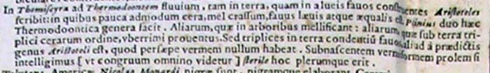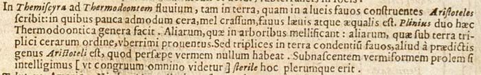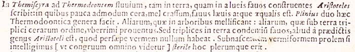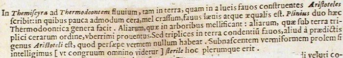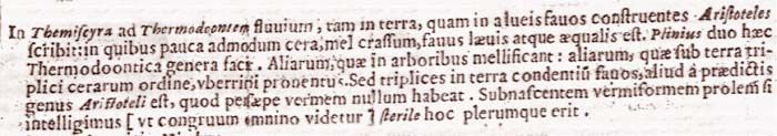 In Themiscyra ad Thermodoontem fluvium, tam in terra, quam in alveis favos construentes Aristoteles scribit: in quibus pauca admodum cera, mel crassum, favus laevis atque aequalis est.205Plinius duo haec Thermodoontica genera facit. Aliarum, quae in arboribus mellificant: aliarum, quae sub terra triplici cerarum ordine, uberrimi proventus.206Sed triplices in terra condentium favos, aliud a praedictis genus Aristoteli est, quod persaepe vermem nullum habeat. Subnascentem vermiformem prolem si intelligimus [ut congruum omnino videtur] sterile hoc plerumque erit.