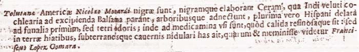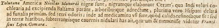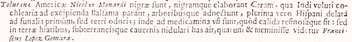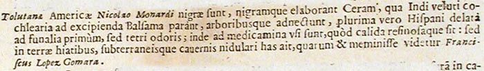 Tolutanae Americae Nicolao Monardi nigrae sunt, nigramque elaborant Ceram, qua Indi veluti cochlearia ad excipienda Balsama parant, arboribusque adnectunt, plurima vero Hispani delata ad funalia primum, sed tetri odoris; inde ad medicamina usi sunt, quod calida resinosaque sit: sed in terrae hiatibus, subterraneis cavernis nidulari has ait, quarum et meminisse videtur Franciscus Lopez Gomara.207