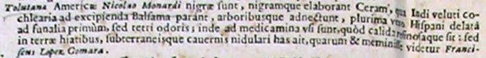 207. Si tratta del cosiddetto Balsamo de Tolu:«Porro apes quae ceram istam conficiunt nigrae sunt, eamque in terrae hiatibus et cavernis subterraneis elaborant. Plurimam autem huiusmodi ceram in Hispaniam deferri vidi, qua ad paranda funalia utebantur, sed ob tetrum quem eius fumus spirabat odorem, vetitus fuit eius usus, postea tamen in medicamenta receptus.», in Caroli Clusi Atrebatis Exoticorum liber decimus sive simplicium medicamentorum ex novo orbe delatorum, quorum in Medicina usu est, Historia hispanico sermone tribus libris descripta a D. Nicolao Monardo [...], op. cit., p. 304. Nelle note del Clusio collocate al termine del capitolo in cui si trova inserito questo passo si legge:«Harum apum meminerunt Franciscus Lopez de Gomara Historia generalis cap. 80, Petrus de Cieça Peruviani chronici prima parte cap. 25, Ioanne de Lery Americanae historiae II cap.», ivi, p. 305.