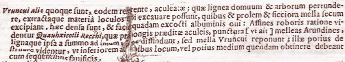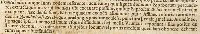 Vi sono anche altre uruncui, secondo la medesima relazione, dotate di pungiglione. Esse possono forare i legni delle case e degli alberi e, una volta estratta la materia, scavarsi loculi, nei quali accogliere con sé la prole e i mieli più secchi. Questi sono secchi e con l'aspetto dell'albume di un uovo cotto. In fatto di forza sembrano affini le quauhxicotli di Recchio che, dotate di pungiglioni alquanto lunghi con i quali, pungendo (come dice) fendono dalla sommità al fondo le canne ricche di miele e i legni stessi, mentre le uruncui depositano i mieli. Esse sembrano piuttosto distruggere, così che si deve loro assegnare un posto inferiore rispetto alle api, anzi un posto intermedio insieme con i seguenti costruttori di favi.