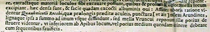 225. «Quid memorem pseudomelissas aculeatas, tetras et cavitates lignorum, quas eaedem effodiunt incolentes, Quauhxicotli a Mexicensibus vocatas? aut fulvas alias, noxio venenatoque, armatas aculeo?», in Rerum Medicarum Novae Hispaniae Thesaurus seu plantarum animalium mineralium Mexicanorum historia ex Francisci Hernandez Novi Orbis medici primarii relationibus in ipsa Mexicana Urbe conscriptis a Nardo Antonio Recchio [...] collecta ac in ordinem digesta a Ioanne Terrentio Lynceo [...] notis illustrata [...], op. cit., p. 334.
